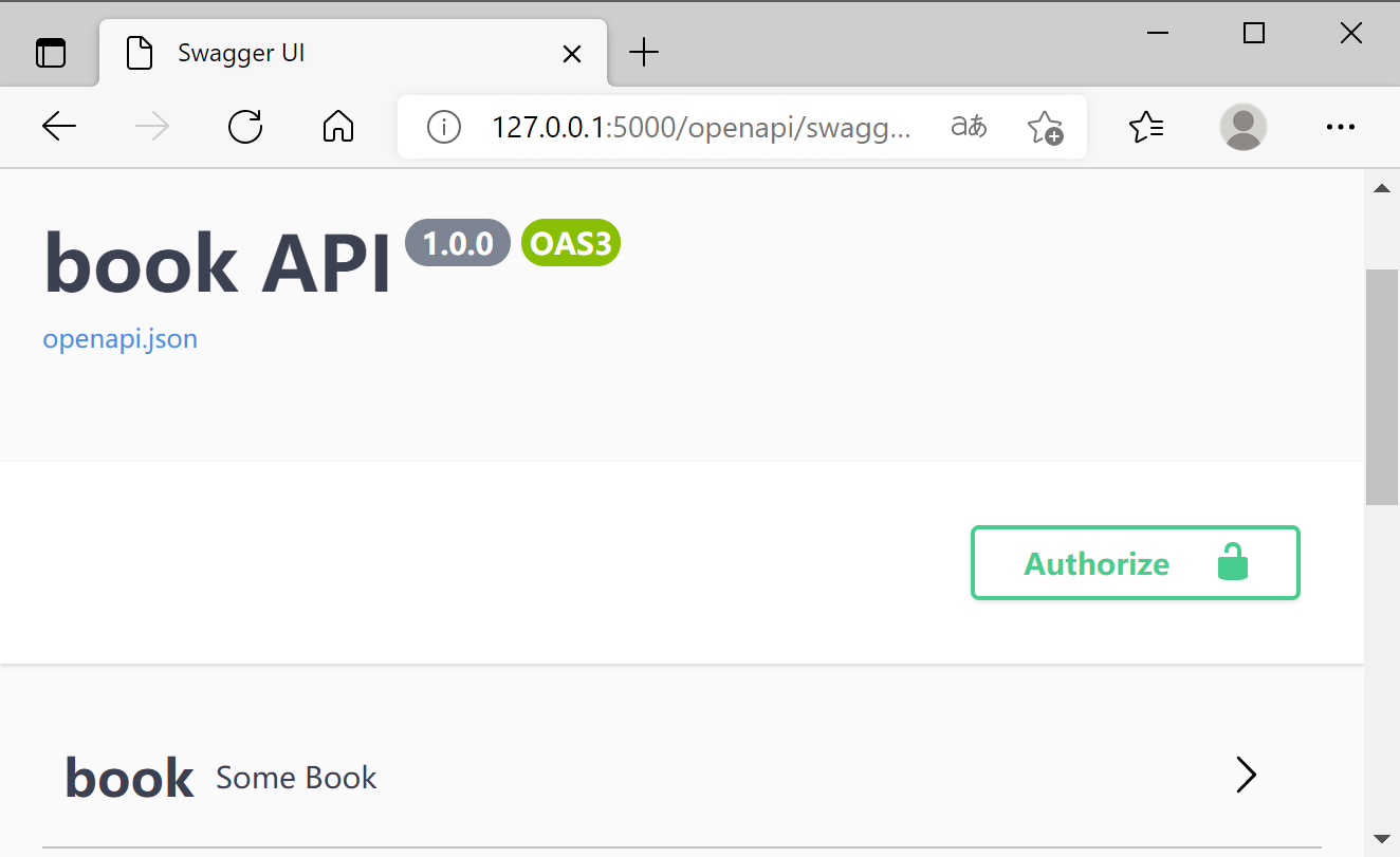 @app.get('/book/<int:bid>',tags=[book_tag],responses={200:BookResponse},security=security)defget_book(path:BookPath,query:BookBody):"""Get book Get some book by id, like: http://localhost:5000/book/3 """return{"code":0,"message":"ok","data":{"bid":path.bid,"age":query.age,"author":query.author}}