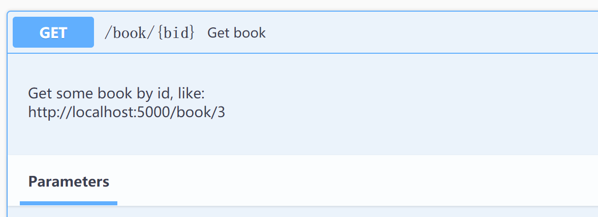 @app.get('/book/<int:bid>',summary="new summary",description='new description')defget_book(path:BookPath,query:BookBody):"""Get book Get some book by id, like: http://localhost:5000/book/3 """return{"code":0,"message":"ok","data":{}}